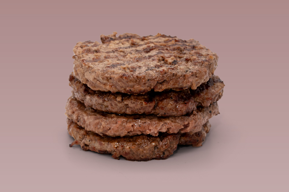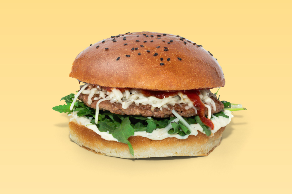 Vse sestavine za 4 Retro burgerje – 4 burger bombete, 4 x 150 g burger mesa, 170 g majoneze z baziliko, 170 g paradižnikove marmelade, 140 g ribanega kozjega sira in 125 g rukole.