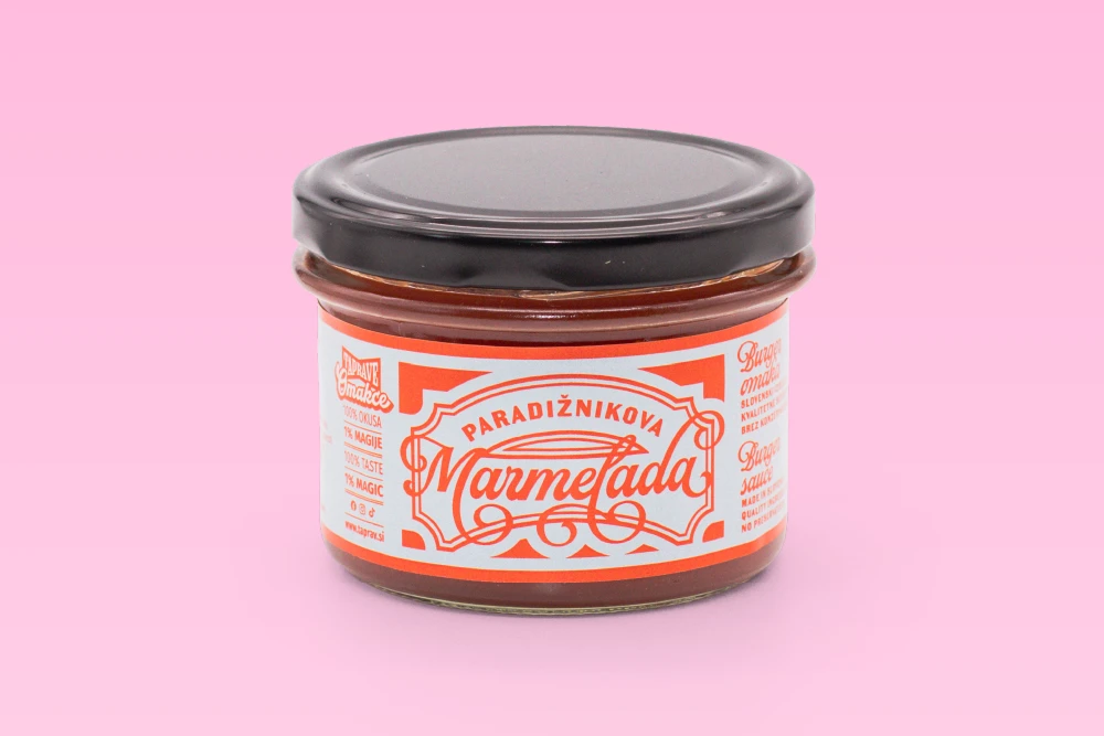 Domača marmelada iz počasi kuhanih paradižnikov. Je glavna zvezda v našem Retro burgerju. Odlična kot dipping sauce ali zraven mesa – za vse ljubitelje sladko-slanih kombinacij. Neto količina 170 g.
